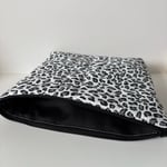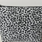 This elegant Grey Leopard makeup bag. Featuring leopard print on a white background, this quilted bag is the perfect blend of minimal and feminine.